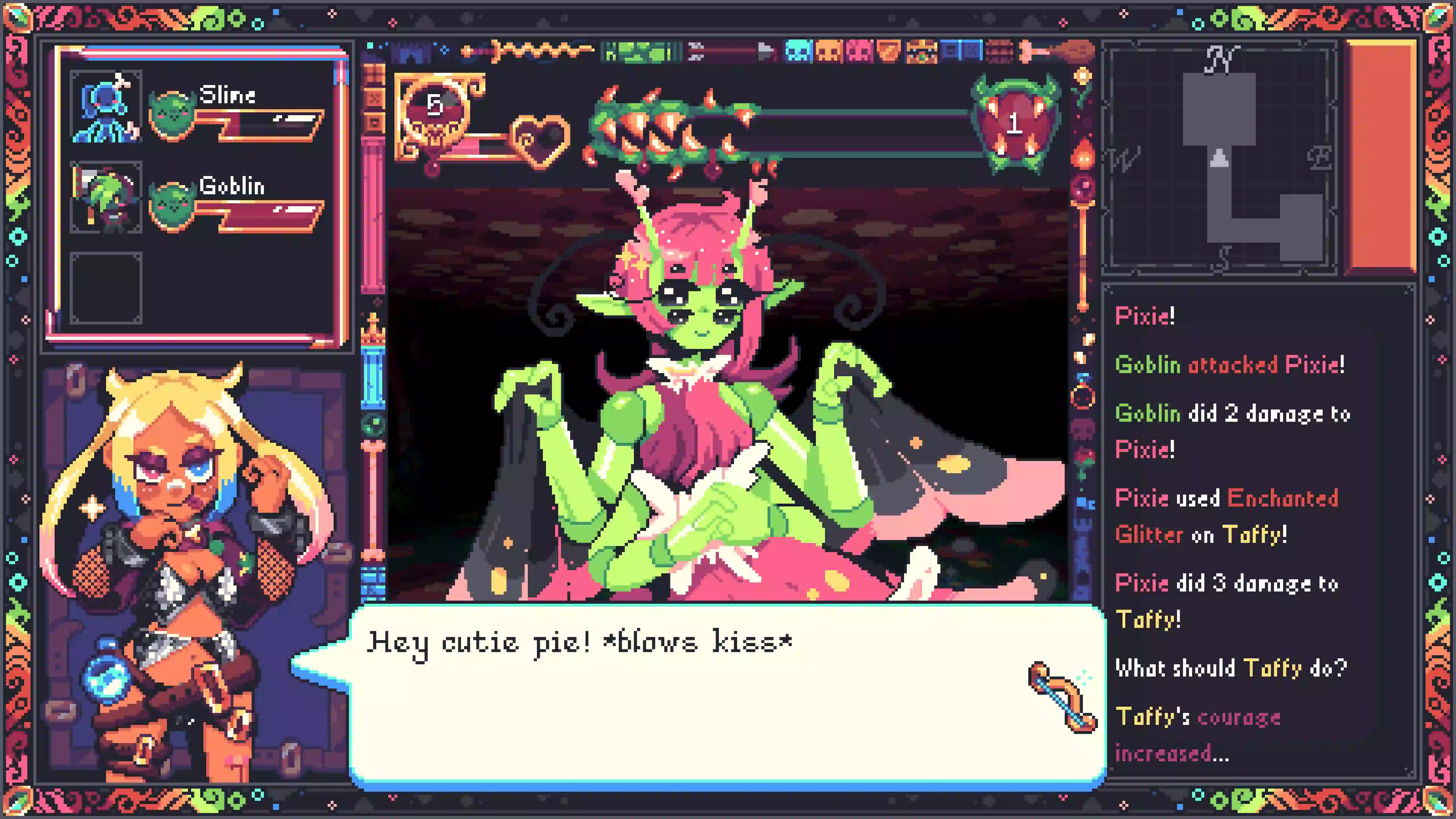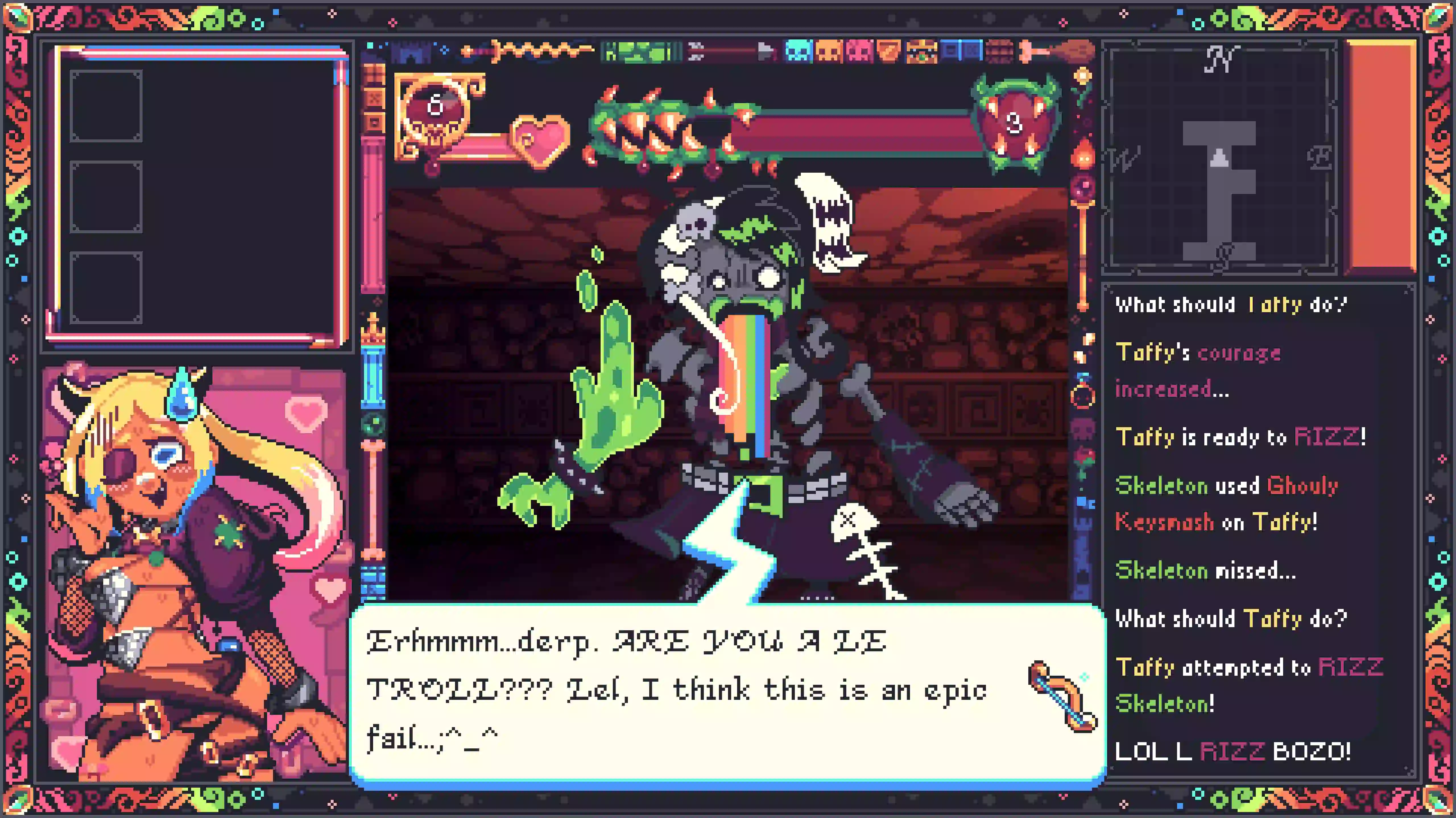 In Rizz Dungeon, play as Taffy, a hopeless weakling flirt who dives into a sprawling dungeon full of Monster Girls with WAY too much personality. Build relationships, survive battles (mostly thanks to them), and try not to make your party jealous- or worse, sulking. Rizz your way down to the bottom of the dungeon to confront your evil Dragon Ex who has stolen your stuff in a nasty breakup, and maybe… mend her heart?!